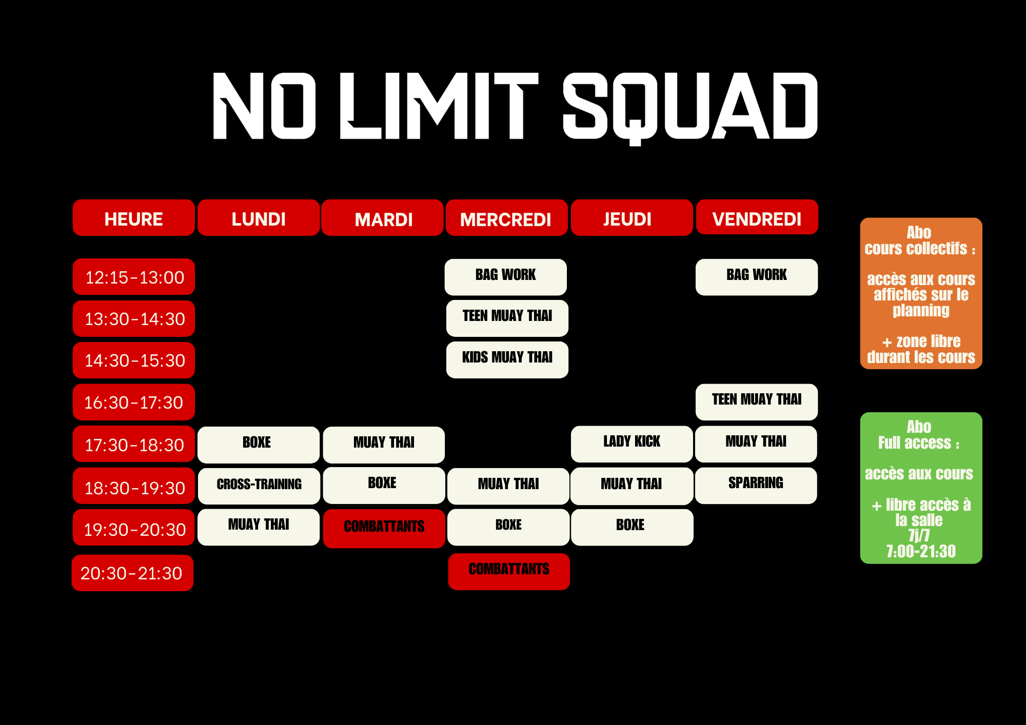 Pour tout renseignement complémentaire, nous contacter par mail à info@nolimitsquad.ch.